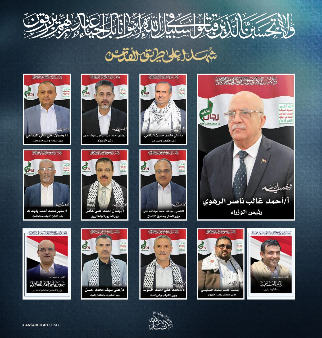 أعلن التلفزيون الرسمي، اليوم الاثنين، أسماء شهداء حكومة التغيير والبناء من خدموا الشعب بأعمالهم وأعمارهم وقدموا في سبيل الله أرواحهم ودماءهم، الذين ارتقوا في العدوان الإسرائيلي الغادر الذي استهدف ورشة عمل للحكومة يوم الخميس الماضي وهم: