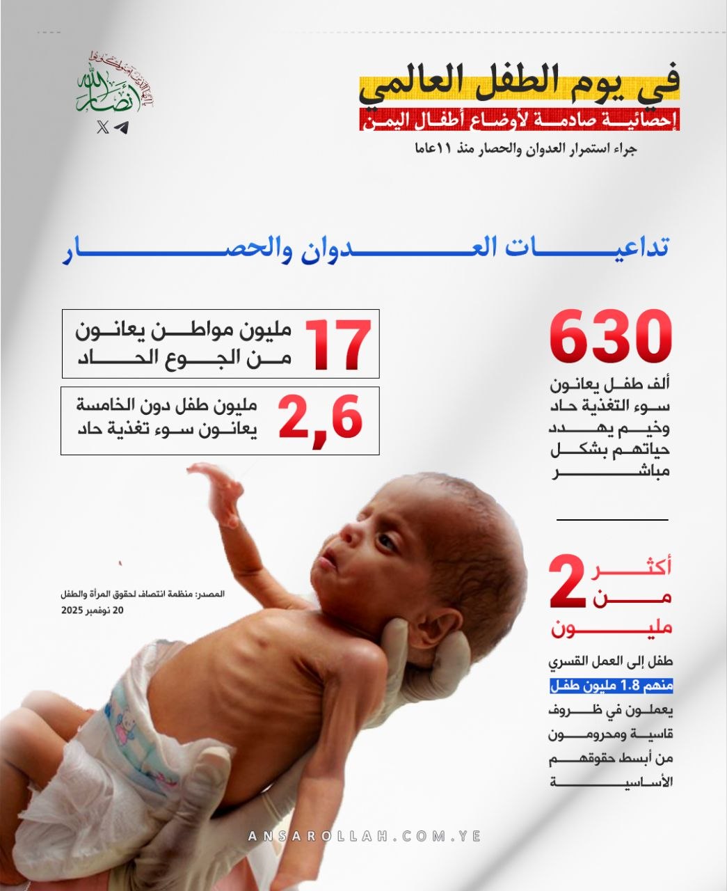 اليوم العالمي لحقوق الطفل، كان ثقيلا في اليمن وغزة، فصدمهم من جديد باستمرار حالة التخاذل الدولي وتهيّب العالم من الشيطان الأمريكي إلى درجة دفن كل المبادئ والقيم الأخلاقية والإنسانية مع جثث الأطفال وأشلاؤهم، ووأد براءة الطفولة بلا أدنى شعور بالأسف. وكان صبيحة الـ 20 من نوفمبر شاهد آخر على سلبية المنظمات الدولية المعنية بالطفولة، فلا هي التي تحركت لإيقاف الوضع القائم الذي يسحق الطفولة ولا هي التي طالبت بتحرك عملي يمنع البطش الأمريكي الإسرائيلي عن تعريض الأطفال في اليمن وغزة للخطر.