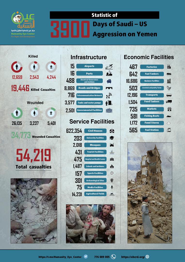 كشف مركز عين الإنسانية للحقوق والتنمية، اليوم الأربعاء، عن اجمالي الخسائر البشرية والمادية التي خلفها تحالف العدوان الأمريكي السعودي الإماراتي خلال 3,900 يوم من العدوان على اليمن.
