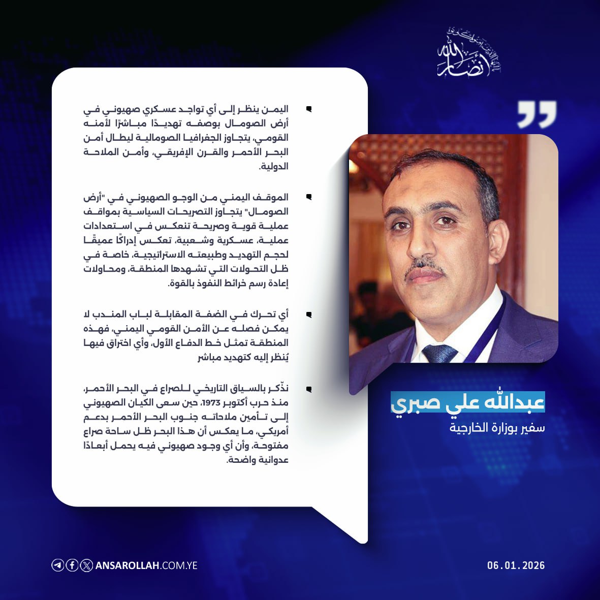 يؤكد السفير في وزارة الخارجية عبد الله علي صبري أن اليمن تنظر إلى أي تواجد عسكري صهيوني في أرض الصومال بوصفه تهديدًا مباشرًا لأمنها القومي، يتجاوز الجغرافيا الصومالية ليطال أمن البحر الأحمر والقرن الأفريقي، وأمن الملاحة الدولية.