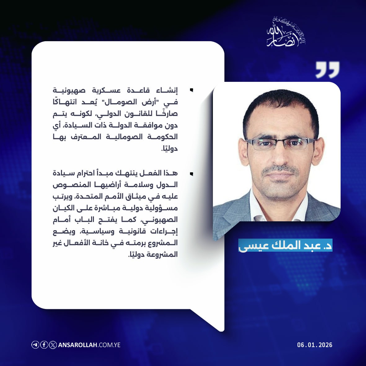 ومنذ اللحظات الأولى، تتعامل القيادة الثورية والسياسية ممثلة بالسيد القائد عبدالملك بدرالدبن الحوثي يحفظه الله مع هذا التحرك باعتباره تهديدًا مباشرًا للأمن القومي اليمني، معلنًا موقفًا حازمًا لا لبس فيه: أي وجود عسكري صهيوني في "أرض الصومال" يُعد خطًا أحمر، وستُواجَه أي محاولة للمساس بالمصالح اليمنية أو بالمحيط الاستراتيجي بالقوة المناسبة، ووفق معادلات ردع واضحة.