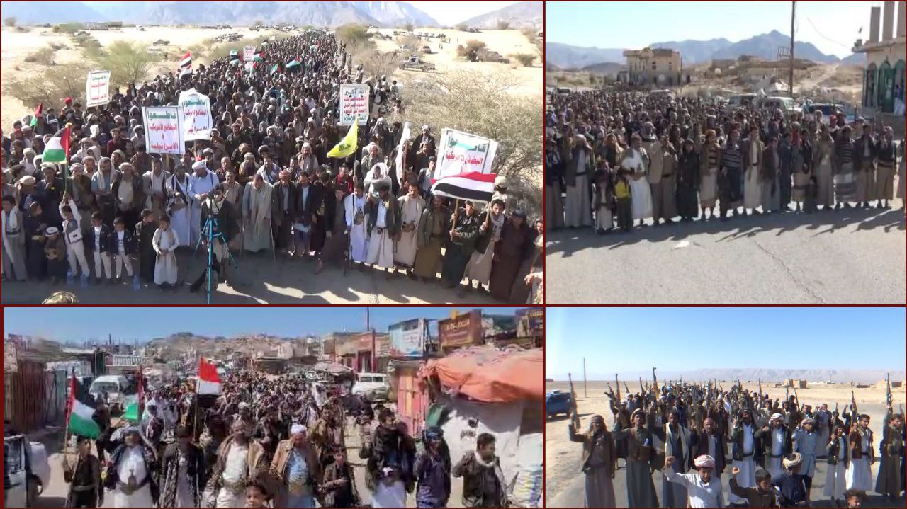 ورددت الحشود عبارات (مع غزة يمنُ الشرفاء.. غضبٌ ونفير ووفاء)، (مع غزة موقفنا الأول.. لا يتغير لا يتبدل)، (يا غزة نحن على المبدأ.. مشتاقون لضرب الأعداء)، (جاهزون ومشتاقون.. ولنصرتكم سباقون)، (إن واصل صهيون عتوّه.. سيعود الإسناد بقوة)، (موقفنا ضد الإجرام.. مع كل شعوب الإسلام).