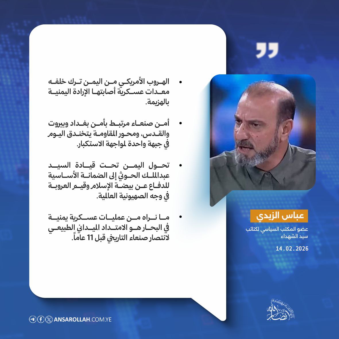 ويشير إلى أن محور المقاومة اليوم يعيش هذه الذكرى وهو في ذروة المواجهة، مؤكداً على "وحدة الخندق" بين العراق واليمن وجميع الشرفاء، حيث يتخندق الجميع في موضع واحد لمواجهة الاستكبار. ويختم برؤية مفادها أن الاستعداد للدفاع عن الحقوق وتحرير الأراضي المغتصبة هو الامتداد الطبيعي لذلك النصر الذي تحقق في صنعاء قبل أحد عشر عاماً، موجهاً التبريكات لأنصار الله ولأحرار العالم بهذا المنجز الذي كسر قيود الاستبداد.