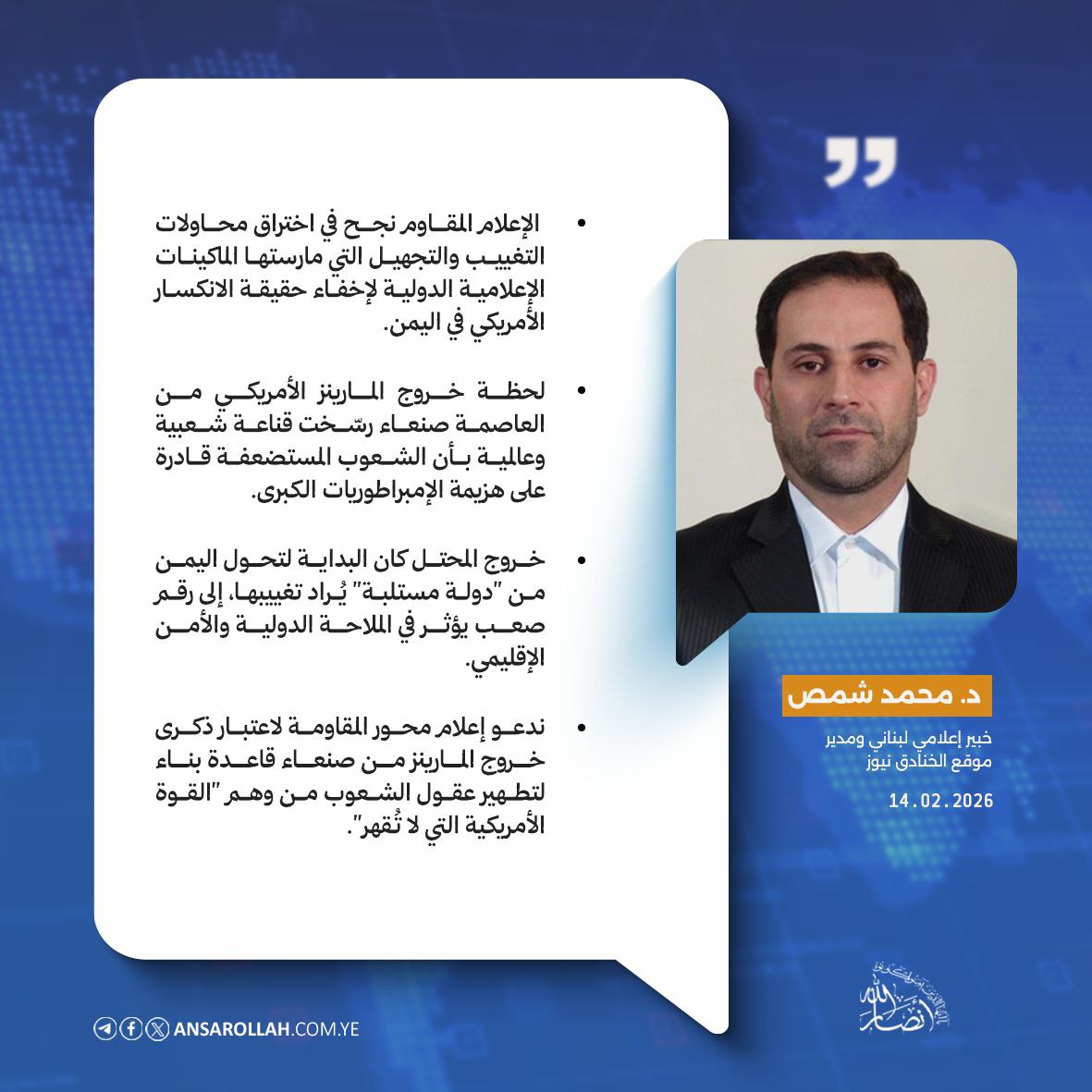في هذا السياق، يرى الخبير الإعلامي اللبناني ومدير موقع "الخنادق" نيوز، الدكتور محمد شمص، أن خروج قوات المارينز من صنعاء يمثل حدثاً مفصلياً وتاريخياً سجلته المقاومة اليمنية (أنصار الله) والجيش اليمني بفعل الجهاد والتضحية.