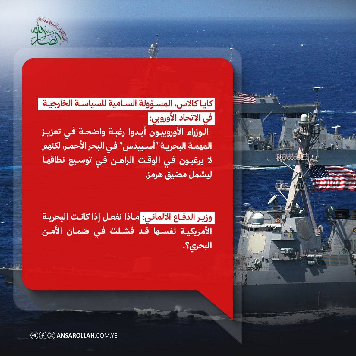 وقالت كايا كالاس، المسؤولة السامية للسياسة الخارجية في الاتحاد الأوروبي، إن الوزراء الأوروبيين أبدوا "رغبة واضحة" في تعزيز المهمة البحرية "أسبيدس" في البحر الأحمر، لكنهم "لا يرغبون في الوقت الراهن في توسيع نطاقها ليشمل مضيق هرمز".