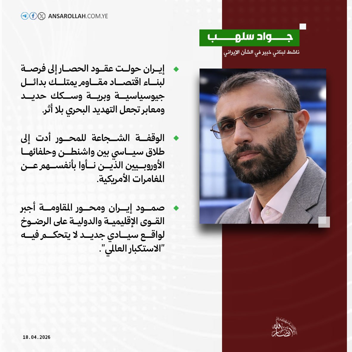 وفي حديثه لموقع "أنصار الله" يؤكد سلهب أن طهران اليوم تحاصر محاصريها عبر شبكة تحالفات برية وجيوسياسية عابرة للحدود، تجعل من التهديدات البحرية الأمريكية مجرد "ضجيج" بلا أثر.