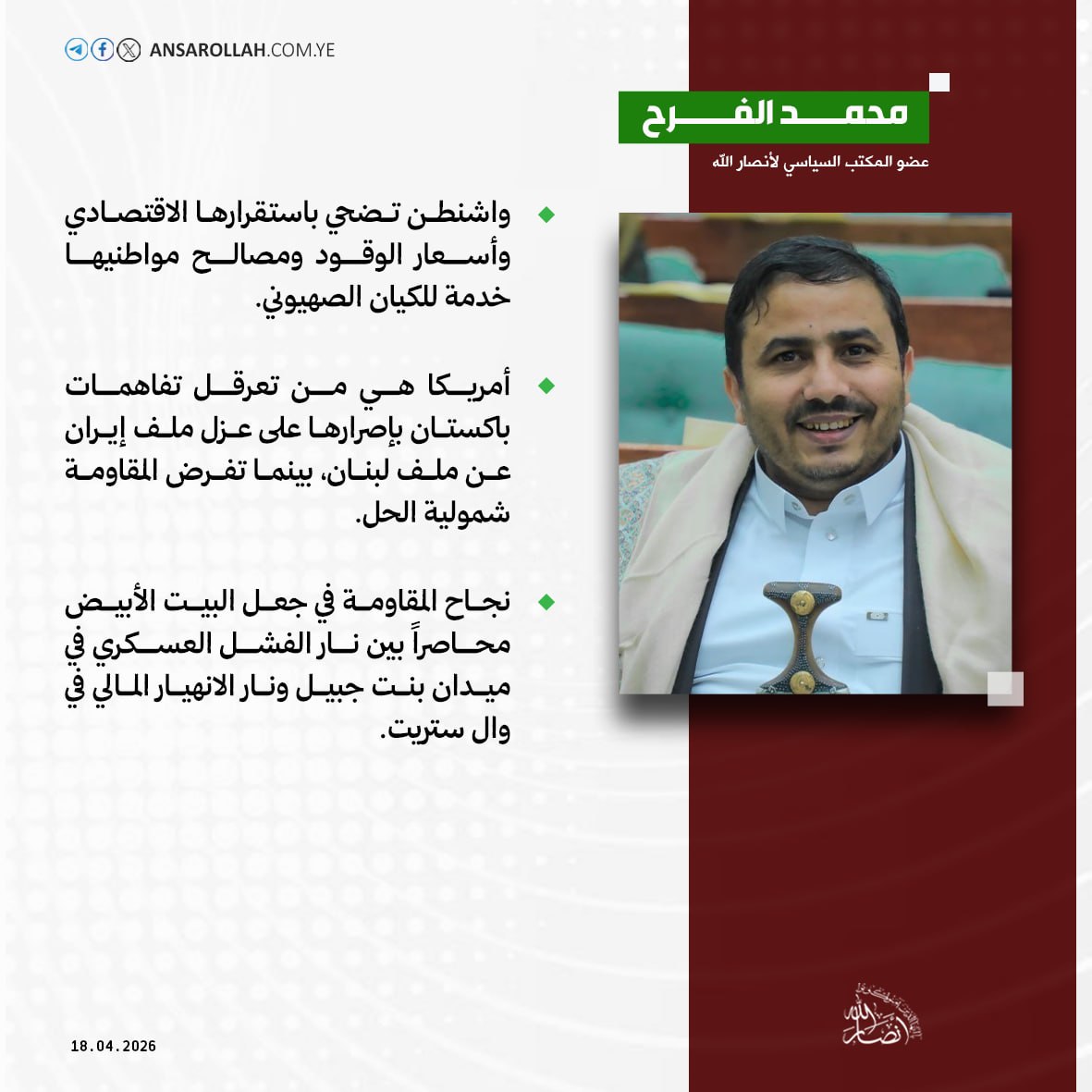 وفي حديثه لموقع "أنصار الله" يرى الفرح أن واشنطن هي من تعرقل اتفاق باكستان بإصرارها على فصل الجبهات، بينما تفرض المقاومة شمولية الحل من غزة إلى بيروت.
