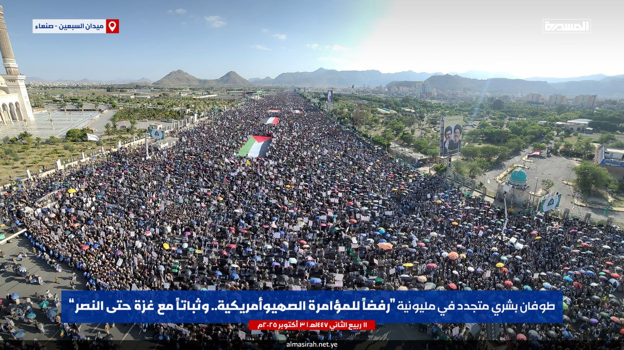 The Yemeni capital, Sana'a, witnessed on Friday a roaring sea of humanity at a million‑strong rally titled “Rejecting the Zionist‑American Conspiracy… Standing with Gaza Until Victory.”