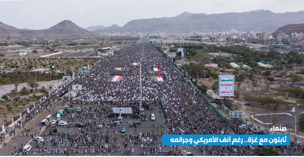 شهدت العاصمة صنعاء اليوم الجمعة، مسيرة جماهيرية كبرى تحت شعار "ثابتون مع غزة.. رغم أنف الأمريكي وجرائمه" تأكيدا على الاستمرار في مساندة ونصرة غزة والشعب الفلسطيني.