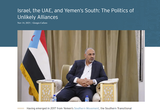 جاء تقرير معهد "المركز العربي في واشنطن" منتصف نوفمبر ليضع النقاط على الحروف: "الانتقالي هو الفصيل اليمني الأكثر انفتاحاً على إسرائيل". التقرير ربط بين تصريحات المرتزق الزبيدي والاهتمام الإسرائيلي المتزايد، مؤكداً أن مضيق باب المندب صار هدفاً استراتيجياً في مشروع "إسرائيل الكبرى"، و"الانتقالي" هو البوابة.