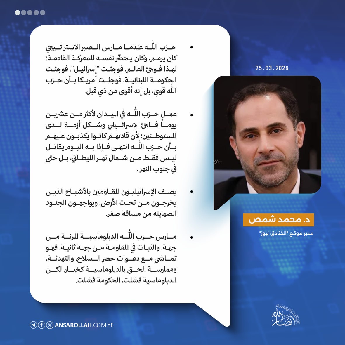 وفي حوار خاص لموقع أنصار الله قال شمص أن المقاومة اللبنانية أعادت خلط الأوراق وأظهرت أن المعادلة في لبنان لم تعد رهناً بالمفاوضات الدبلوماسية أو القرارات الحكومية، وإنما بيد قوة الميدان، لافتا إلى أن المجاهدين المدعومين بقاعدة شعبية واسعة، تمكنوا من فرض قواعد اشتباك جديدة تُثبت حق المقاومة في الدفاع عن النفس، وتعيد صياغة التوازن العسكري والسياسي على الأرض.