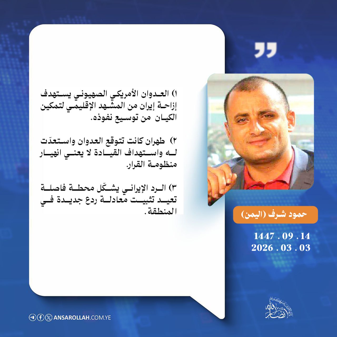 In remarks to Ansar Allah’s website, Sharaf emphasized that Tehran had anticipated such a scenario and had prepared for it at multiple levels, arguing that the Iranian response reflects a high level of strategic readiness. He pointed out that targeting the leadership—including the martyrdom of Sayyed Ali Khamenei—does not lead to the collapse of the decision-making system. Instead, it fosters greater cohesion within state institutions. Sharaf described the battle as decisive, asserting that its outcome will determine the future position of the Axis of Resistance in the coming phase.